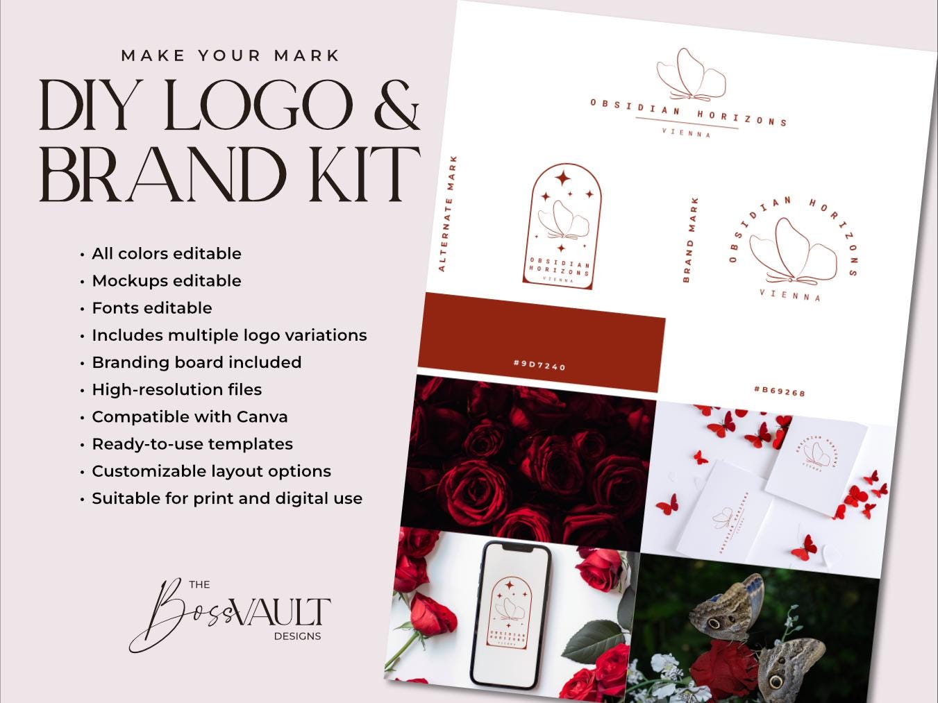 DIY Butterfly Logo Set, Boutique Logo Design, Beauty Logo Branding Kit, Red and White Brand Board Design, Cosmetic Logo Design